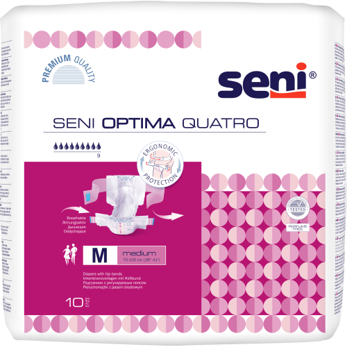 Seni Optima Quatro ademende incontinentieslips hebben een extra hoog absorptievermogen en zijn geschikt voor vrouwen en mannen met zeer zware incontinentie. De slips zijn voorzien van verstelbare heupbanden met een dubbel sluitsysteem en daardoor gemakkelijk aan te passen aan de lichaamsomvang. Door de anatomische pasvorm met elastische tailleband voor en achter sluiten de slips perfect aan. De vochtwerende randjes aan de zijkanten bieden extra bescherming tegen doorlekken. De dubbel absorberende kern met antibacteriële superabsorber neutraliseert urinegeur. De dubbele vochtigheidsindicator geeft aan wanneer er moet worden verschoond. Verkrijgbaar in twee maten Medium en Large. Inhoud verpakking: 10 stuks. Prijs vanaf €14,76.