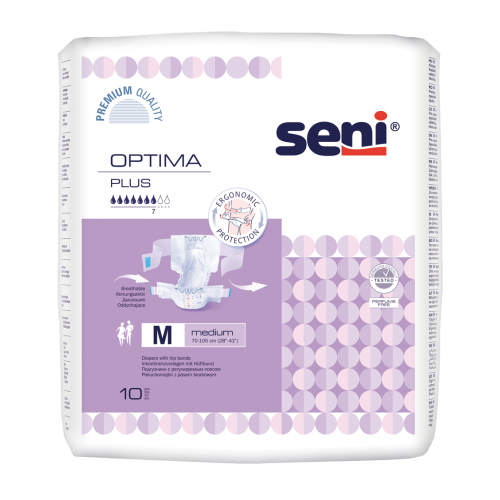 Seni Optima Plus ademende incontinentieslips hebben een verhoogd absorptievermogen en zijn geschikt voor vrouwen en mannen met zware incontinentie. De slips zijn voorzien van verstelbare heupbanden met een dubbel sluitsysteem en daardoor gemakkelijk aan te passen aan de lichaamsomvang. Door de anatomische pasvorm met elastische tailleband voor en achter sluiten de slips perfect aan. De vochtwerende randjes aan de zijkanten bieden extra bescherming tegen doorlekken. De dubbel absorberende kern met antibacteriële superabsorber neutraliseert urinegeur. De dubbele vochtigheidsindicator geeft aan wanneer er moet worden verschoond. Verkrijgbaar in drie maten Medium, Large en Extra Large. Inhoud verpakking: 10 stuks. Prijs vanaf €12,55.