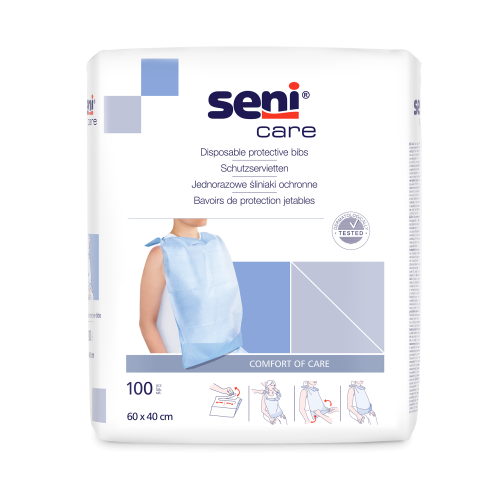 Seni Care slabben zijn gemaakt van zachte celstof en aan één zijde gelamineerd. De slabben zijn voorzien van een speciale uitsnijding voor bevestigingslinten en een beschermende kraag. Na bevestiging kan de onderkant worden uitgevouwen tot een opvangzakje. Geschikt voor eenmalig gebruik. Groot formaat, 60 x 40 cm. Inhoud verpakking: 100 stuks.